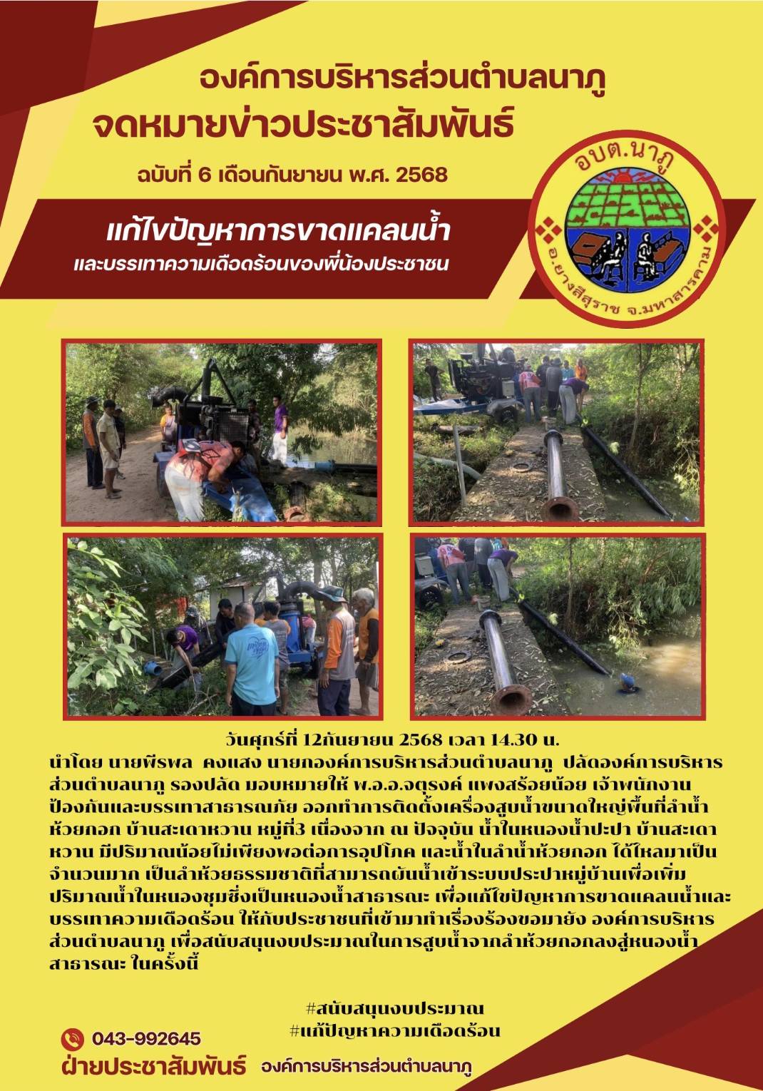 นำโดย นายพีรพล คงแสง นายกองค์การบริหารส่วนตำบลนาภู ปลัดองค์การบริหารส่วนตำบลนาภู รองปลัด มอบหมายให้ พ.อ.อ.จตุรงค์ แพงสร้อยน้อย เจ้าพนักงานป้องกันและบรรเทาสาธารณภัย ออกทำการติดตั้งเครื่องสูบน้ำขนาดใหญ่พื้นที่ลำน้ำห้วยกอก บ้านสะเดาหวาน หมู่ที่3 เนื่องจาก ณ ปัจจุบัน น้ำในหนองน้ำปะปา บ้านสะเดาหวาน มีปริมาณน้อยไม่เพียงพอต่อการอุปโภค และน้ำในลำน้ำห้วยกอก ได้ไหลมาเป็นจำนวนมาก เป็นลำห้วยธรรมชาติที่สามารถผันน้ำเข้าระบบประปาหมู่บ้านเพื่อเพิ่มปริมาณน้ำในหนองชุมซึ่งเป็นหนองน้ำสาธารณะ เพื่อแก้ไขปัญหาการขาดแคลนน้ำและบรรเทาความเดือดร้อน ให้กับประชาชนที่เข้ามาทำเรื่องร้องขอมายัง องค์การบริหารส่วนตำบลนาภู เพื่อสนับสนุนงบประมาณในการสูบน้ำจากลำห้วยกอกลงสู่หนองน้ำสาธารณะ ในครั้งนี้
