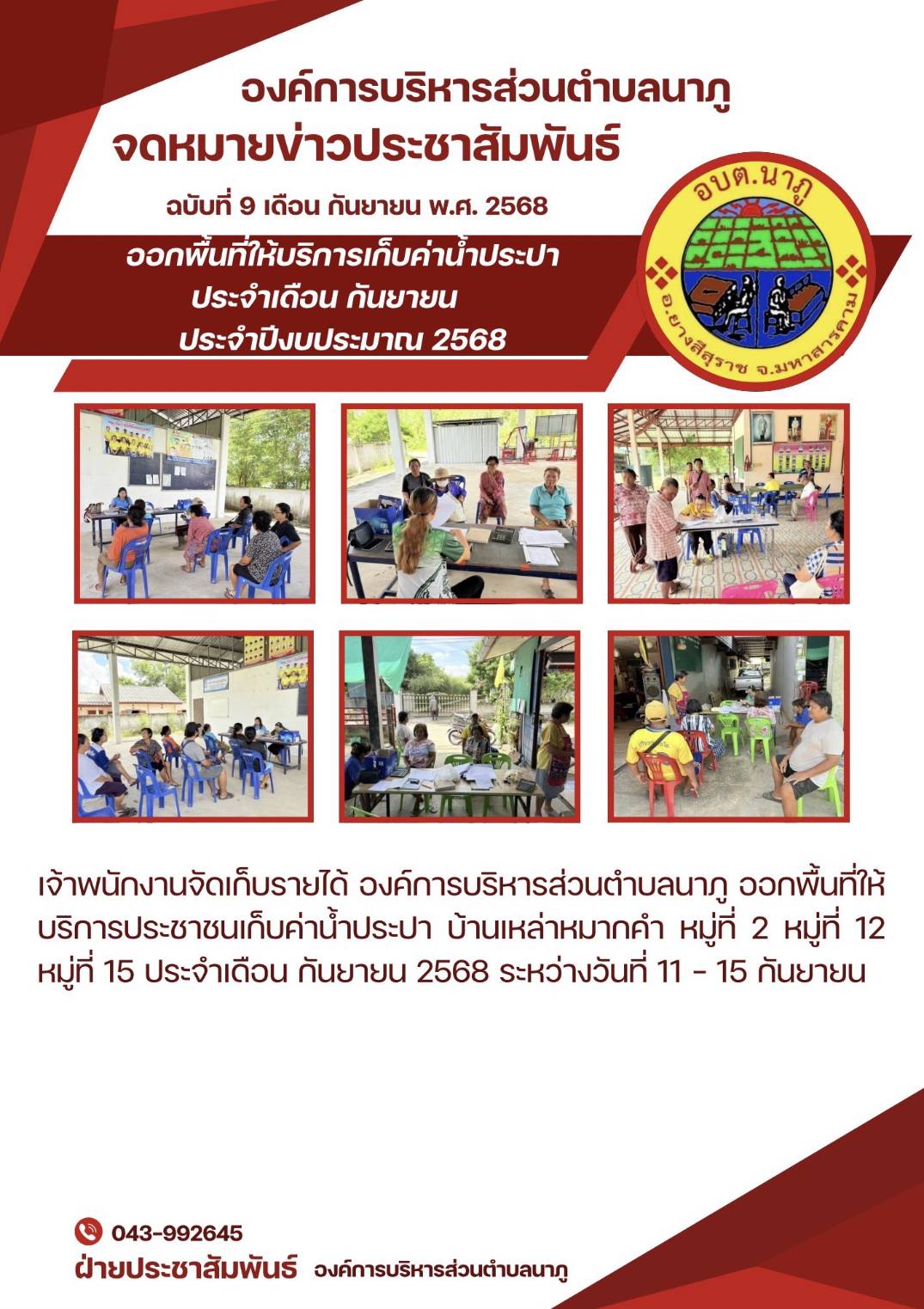เจ้าพนักงานจัดเก็บรายได้ #องค์การบริหารส่วนตำบลนาภู ออกพื้นที่ให้บริการประชาชนเก็บค่าน้ำประปา บ้านเหล่าหมากคำ หมู่ที่ 2 หมู่ที่ 12 หมู่ที่ 15 ประจำเดือน กันยายน 2568 ระหว่างวันที่ 11 - 15 กันยายน