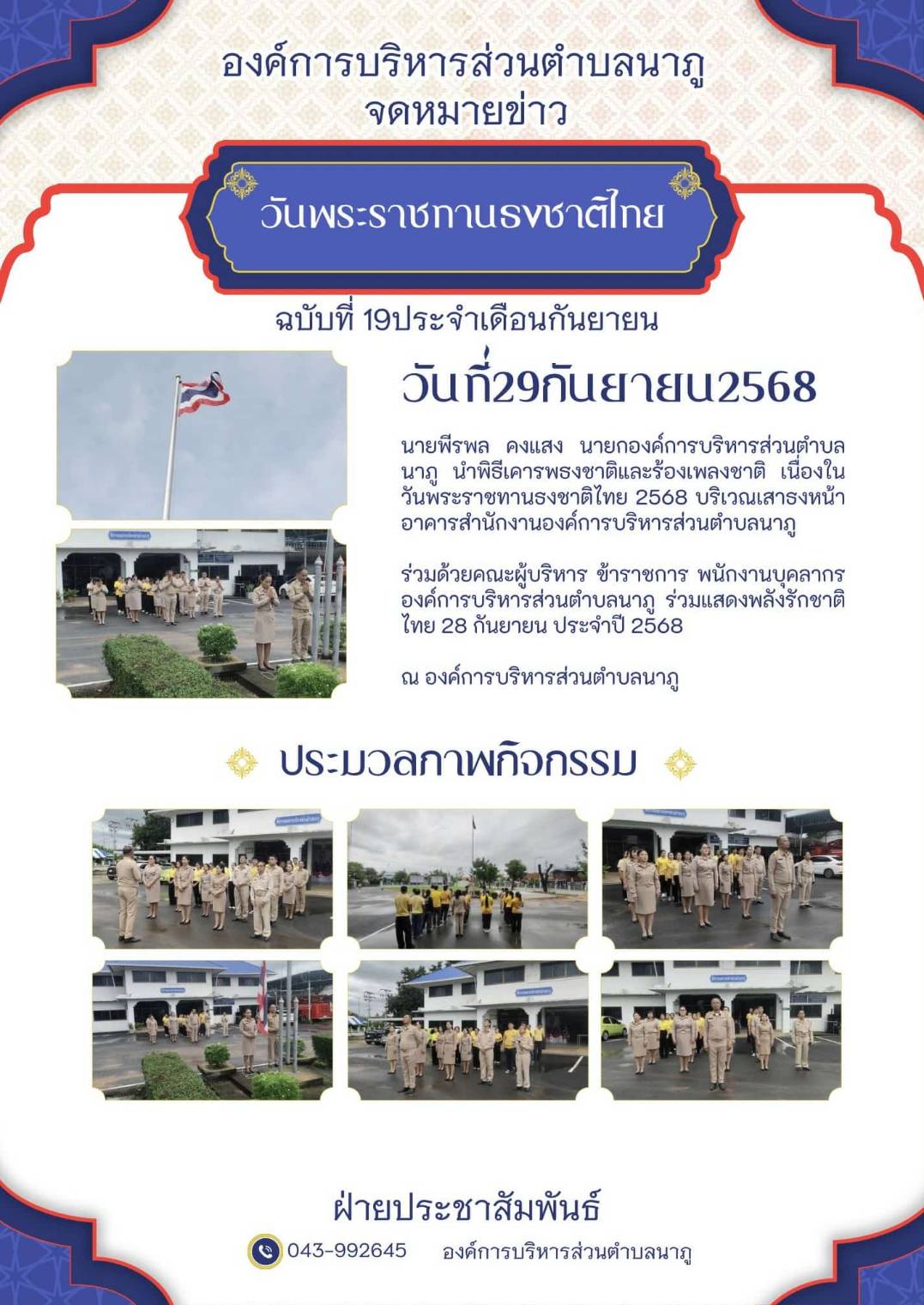 วันที่ 29 กันยายน 2568 นายพีรพล คงแสง นายกองค์การบริหารส่วนตำบลนาภู พร้อมด้วยคณะผู้บริหาร ข้าราชการ พนักงานบุคลากร องค์การบริหารส่วนตำบลนาภู จัดกิจกรรมเคารพธงชาติและร้องเพลงชาติ เนื่องในวันพระราชทานธงชาติไทย 28 กันยายน 2568 บริเวณเสาธงหน้าอาคารสำนักงานองค์การบริหารส่วนตำบลนาภู ร่วมแสดงพลังรักชาติไทย สร้างความภาคภูมิใจและเป็นการน้อมรำลึกในพระมหากรุณาธิคุณของสมเด็จพระมงกุฎเกล้าเจ้าอยู่หัวที่ทรงพระราชทานธงไตรรงค์ เป็นธงชาติไทย เมื่อปี 2460